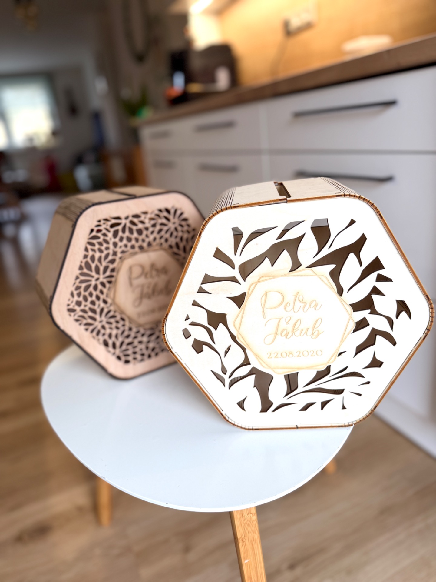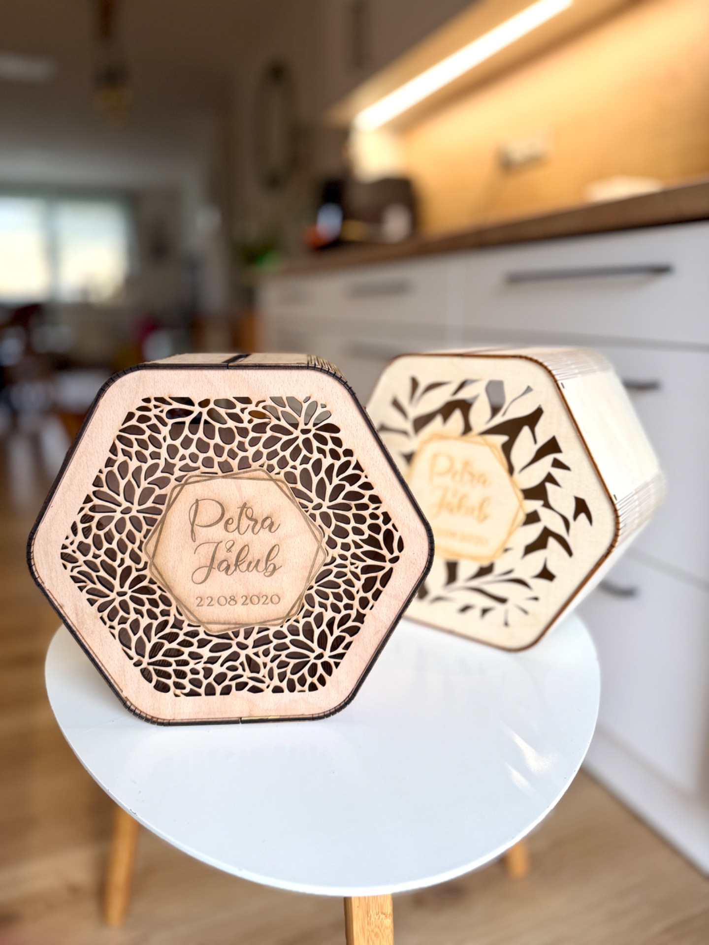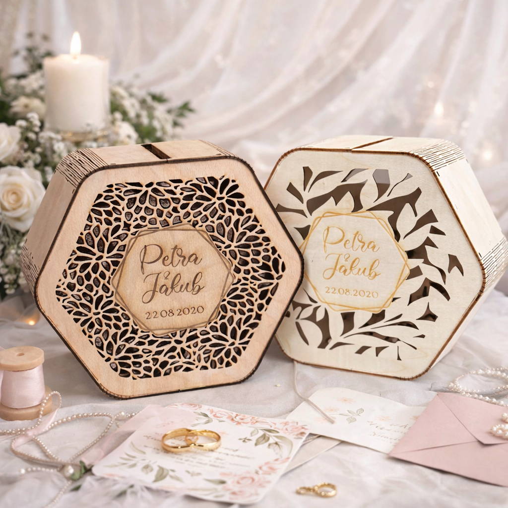 Stačí si vybrat motiv výřezu, barvu dřeva a zvolit si text, který budete chtít (jména, příjmení, datum, nebo třeba jen děkuji).